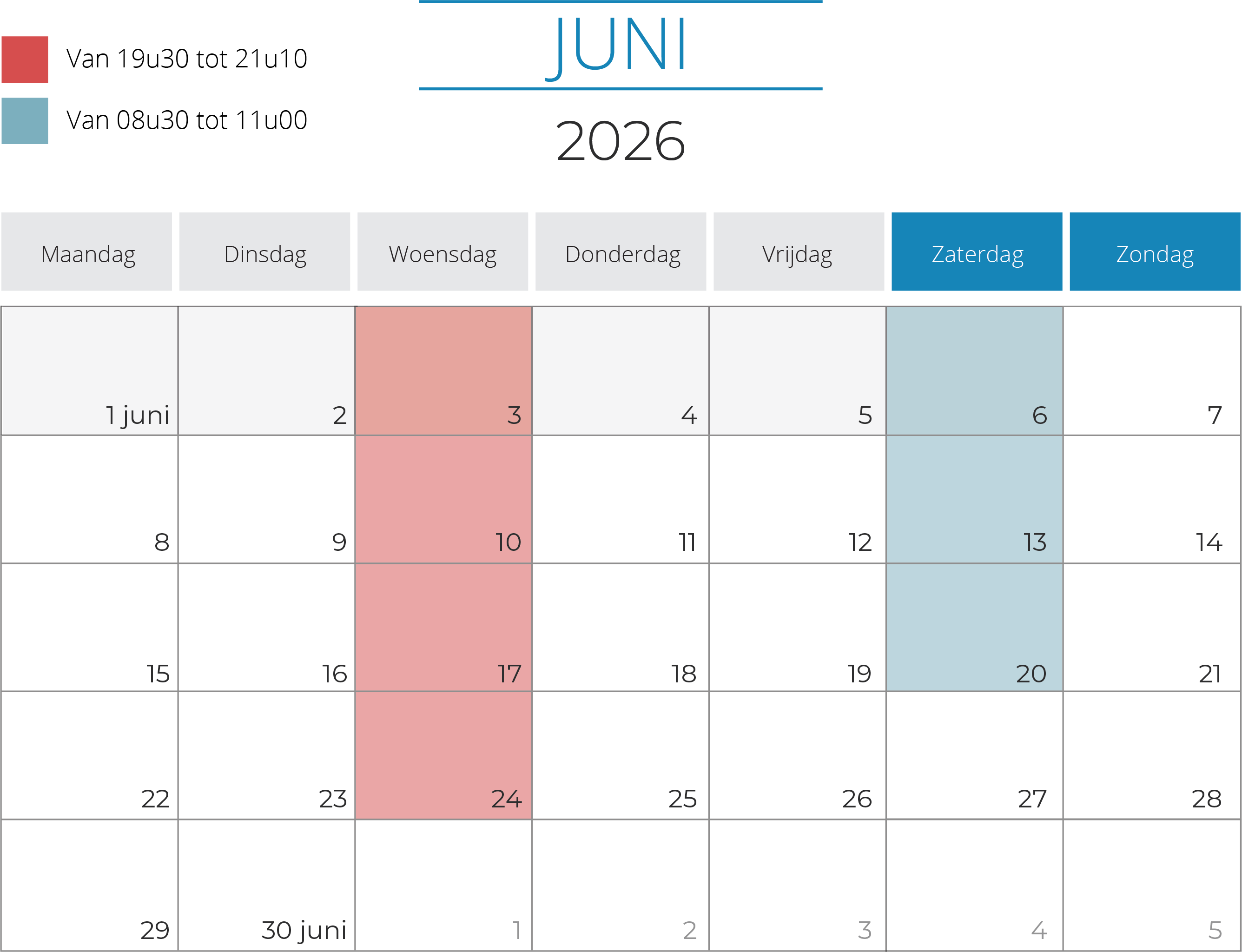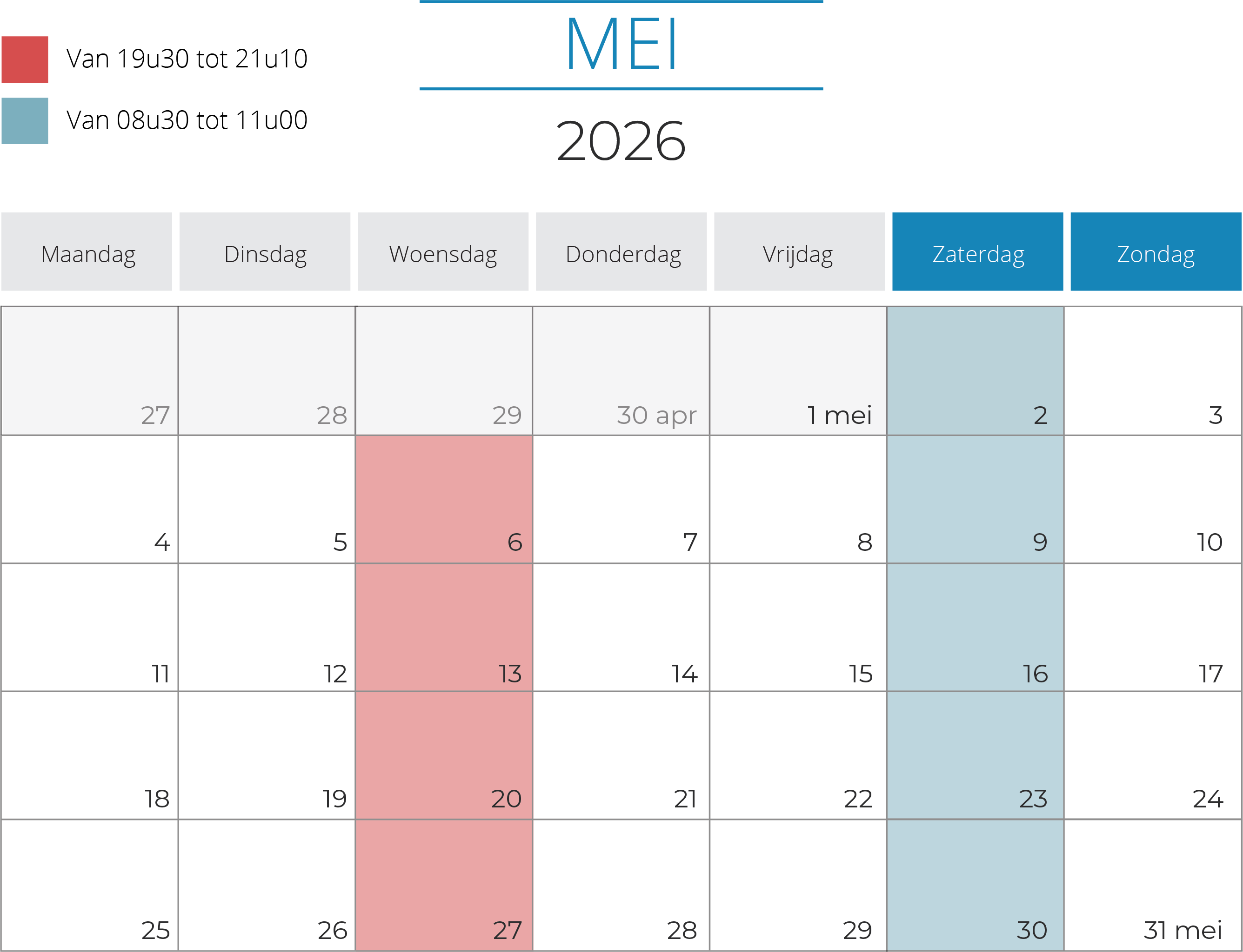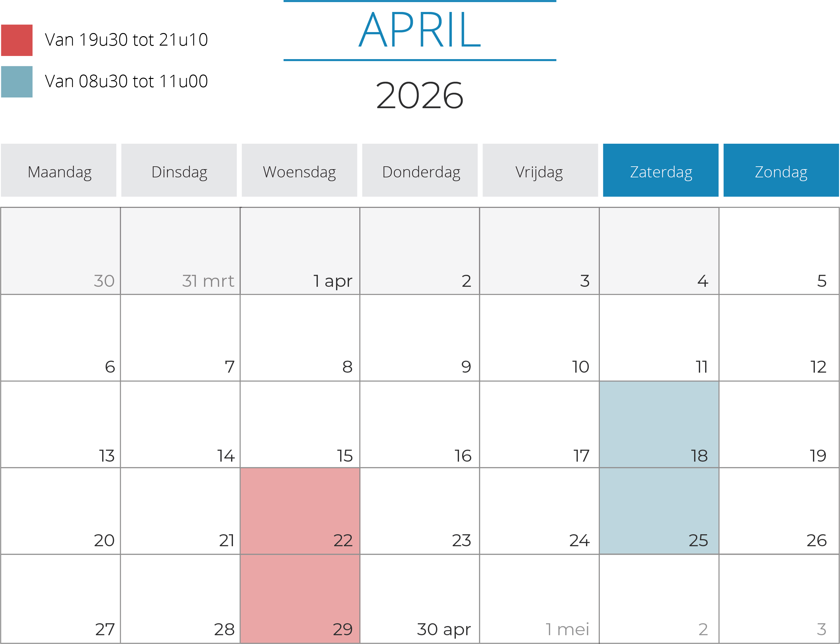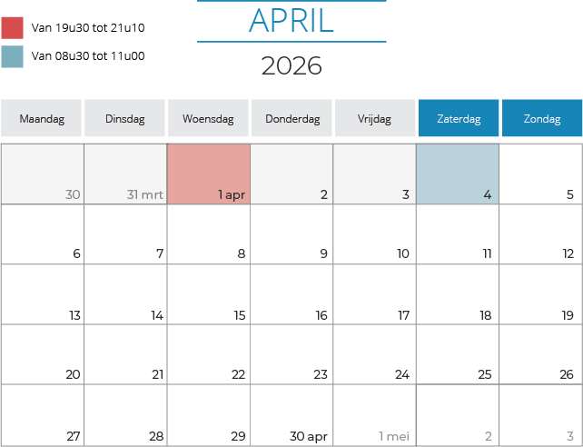 Telkens van 19.30 uur tot 20.20 uur en van 20.20 uur tot 21.10 uur