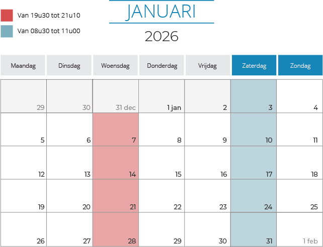 Van woensdag 7 januari tot en met woensdag 1 april (13 lessen)