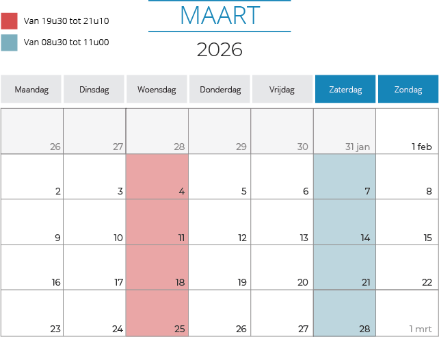 Telkens vanaf 8.30 uur tot 9.20 uur, 9.20 uur tot 10.10 uur